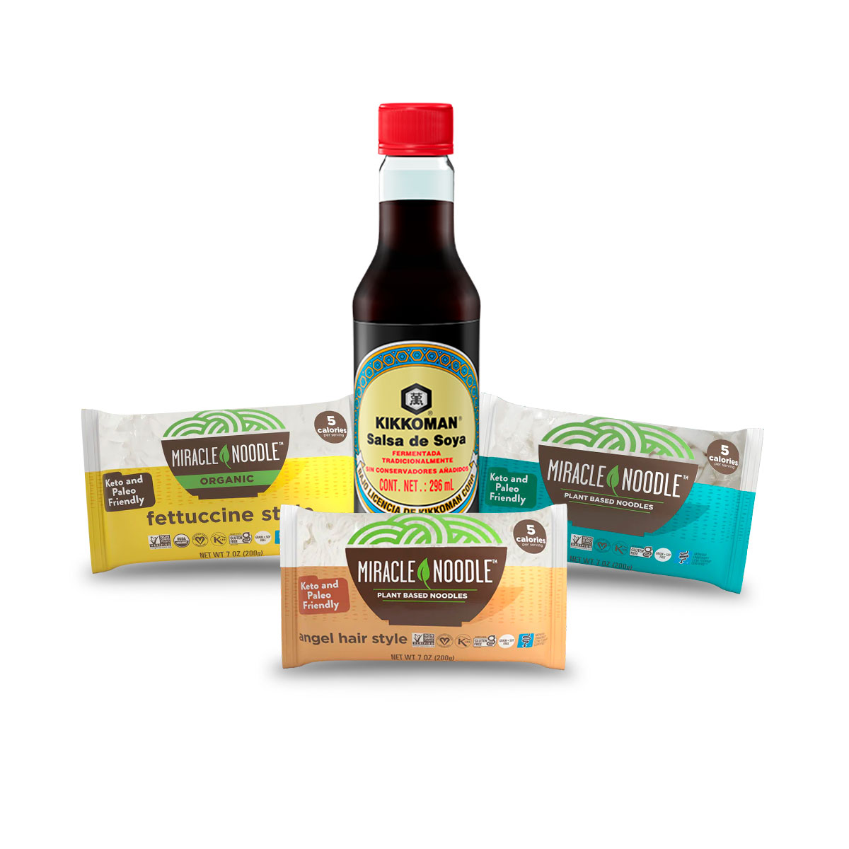 Salsa de soya regular Kikkoman 5 onz + Miracle Noodles, puedes escoger entre fettuccine style | Angel hair style | ziti style.